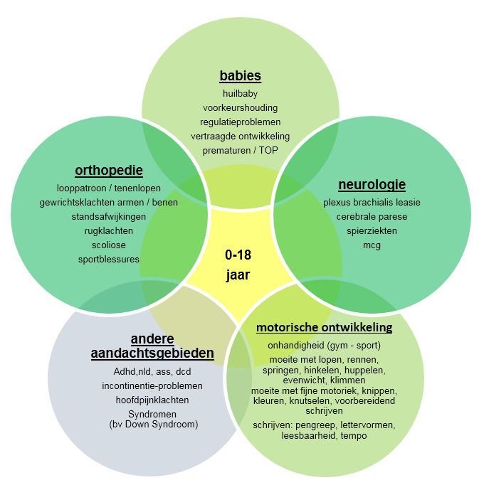 De kinderfysiotherapeut van Sam-Sam beschikt over specialistische kennis en affiniteit voor het behandelen van kinderen met: